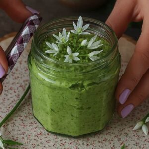 - In ein steriles Glas füllen und mit etwas Olivenöl bedecken – fertig! Wer mag, kann das Pesto mit ein paar Bärlauchblüten oder essbaren Blüten dekorieren – ein echter Hingucker!